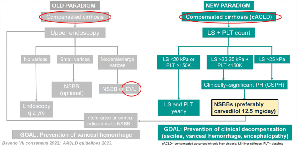 - EGD no longer uniformly recommended for variceal screening in new diagnosis of compensated cirrhosis (risk stratification with liver stiffness by Fibroscan + PLT count -> carvedilol if high risk; scope only if intolerant/CI to beta-blocker)